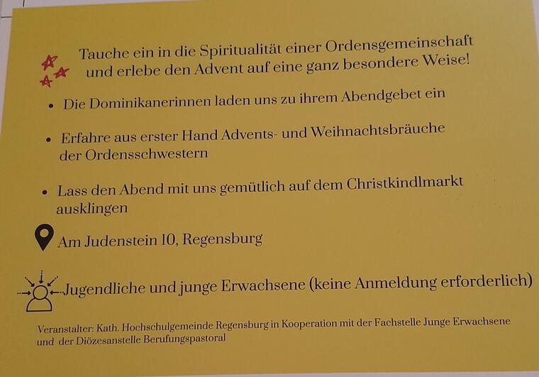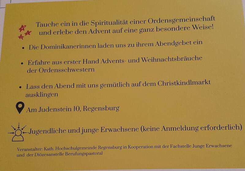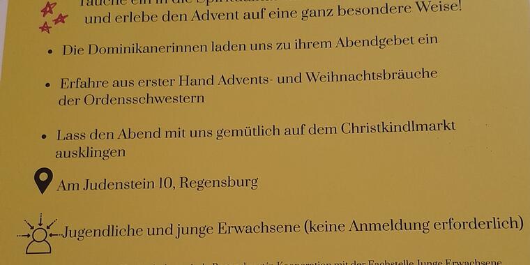 Wir treffen uns am 10.12. 2025 um 18 Uhr am Jugendstein 10 in Regensburg und besuchen das Kloster der Dominikanerinnen.